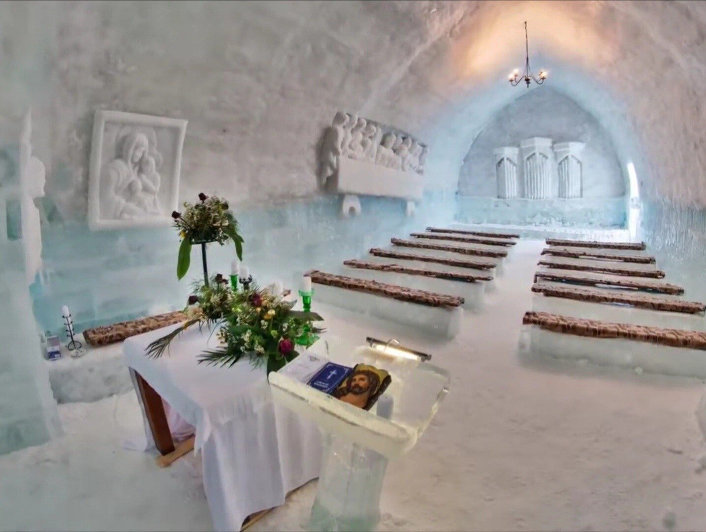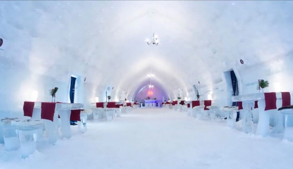 Turiştii au avut parte de paturi matrimoniale din gheaţă, acoperite cu blană de miel. Masa şi scaunele erau, de asemenea, sculptate în gheaţă. Iluminatul în interior era asigurat cu lămpi fluorescente, iar vesela şi paharele personalizate pentru un decor îngheţat. Hotelul avea atât bar, restaurant, dar şi discotecă, toate desigur, din gheaţă, iar toate cocktailurile s-au servit doar cu gheaţă.