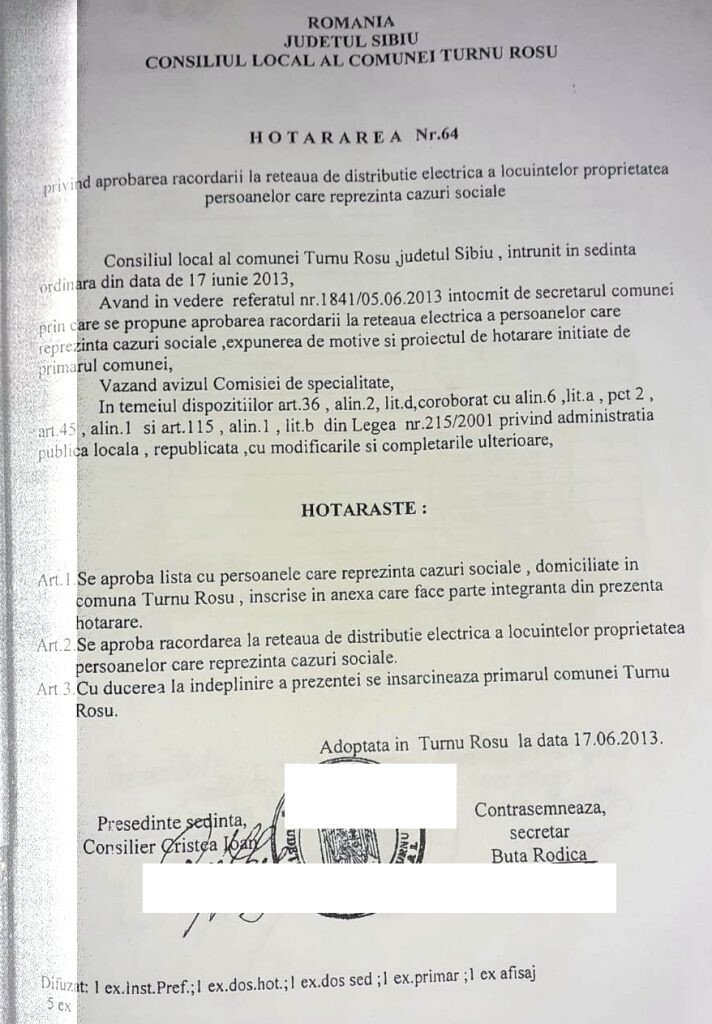 Dar primarul Stelian Istrate (şi atunci, şi acum pe funcţie) a transformat hotărârea în monedă de schimb pentru voturi şi influenţă. Astfel în perioada 2013-2018 acesta a emis adeverinţe, semnate DOAR de el, prin care atesta că diferiţi indivizi din localitate sunt cazuri sociale şi pot beneficia pentru locuinţe ilegale de racord la curent. Doar că beneficiarii „asistaţi sociali” au fost doar doi cei din lista de 22 aprobată iniţial. Restul au fost alţi oameni din Turnu Roşu şi satul Sebeşul de Jos.