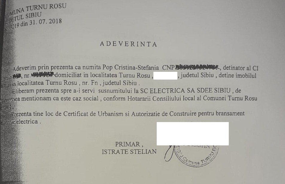 Poliţia a identificat peste 20 de astfel de adeverinţe, dar cercetările continuă. Pe fiecare adeverinţă Istrate a scris că beneficiarul „este caz social”, că a fost emisă în baza Hotărârii de Consiliu Local nr 64 din 2013 şi sintagma incredibilă „Prezenta ţine loc de Certificat de Urbanism şi Autorizaţie de Construire pentru branşament energie electrică”. Cu această adeverinţă omul pleca la Electrica SA SDEE Sibiu care îl branşa la curent.