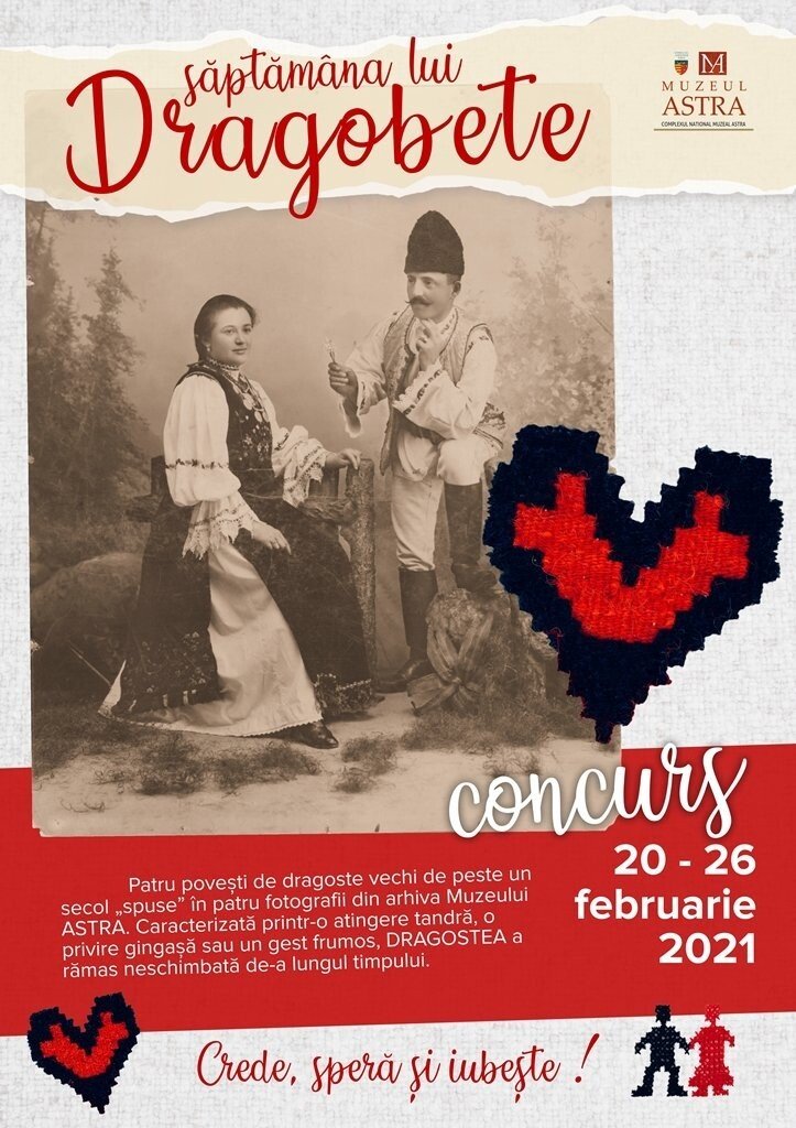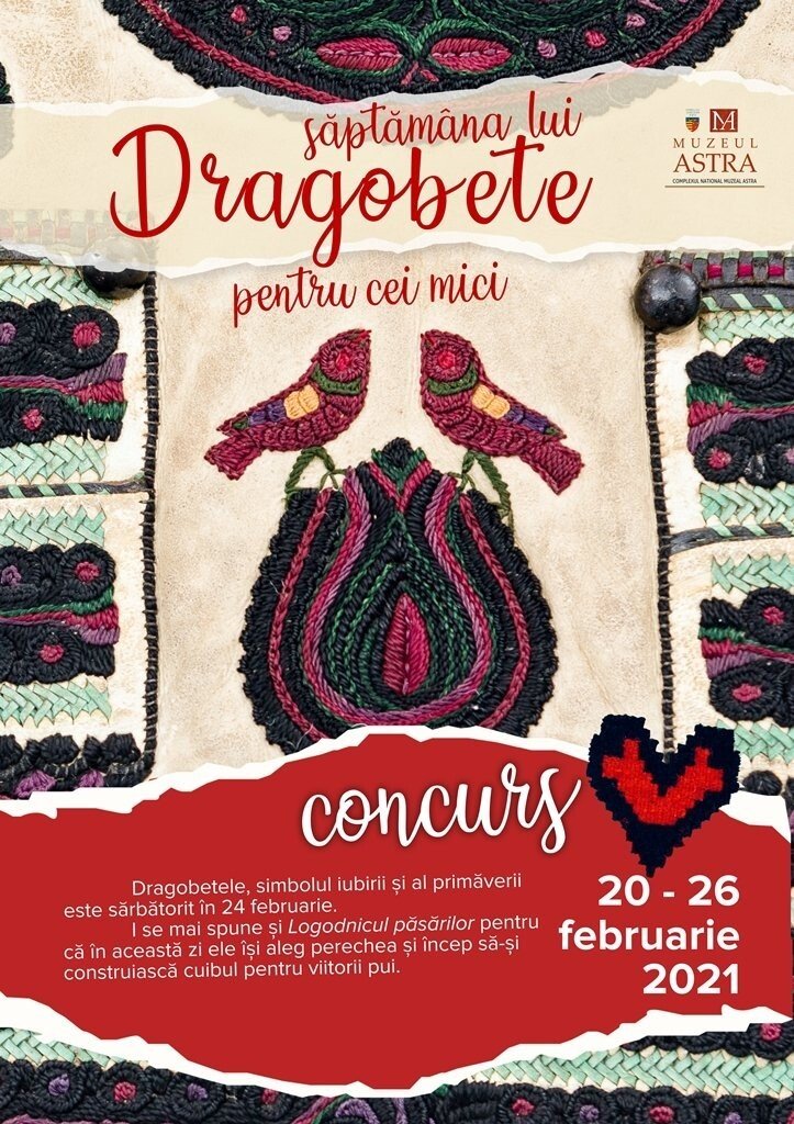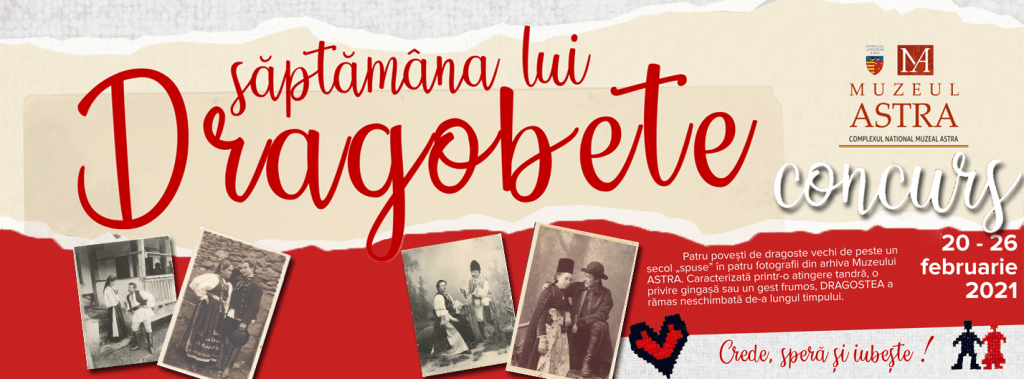 Muzeul ASTRA va organiza în perioada 20-26.02.2021 evenimentul ,,Săptămâna lui Dragobete”. Inițiativa va avea două coordonate, una destinată cuplurilor de îndrăgostiți, cealaltă pregătită special pentru copii cu spirit de inițiativă. Mai precis, timp de o săptămâna toți îndrăgostiții & copii vor putea participa astfel la două concursuri cu premii special pregătite pentru Sărbătoarea Dragobetelui.