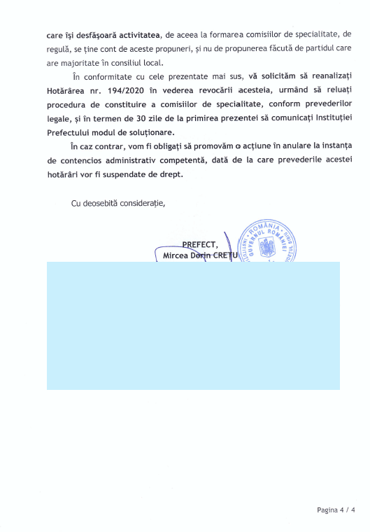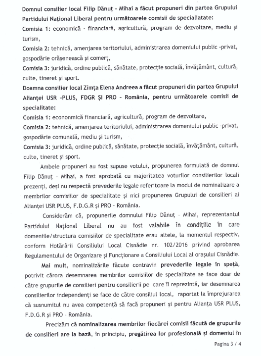 Alianța USR PLUS Cisnădie a primit răspuns din partea Prefecturii Sibiu referitor la contestarea procesului de constituire a comisiilor de specialitate ale Consiliului Local Cisnădie. Prefectura Sibiu a constatat ilegalitatea Hotărârii de Consiliu Local din luna decembrie 2020, prin care majoritatea PNL, PSD, FDGR a votat o propunere pentru componența comisiilor, ignorând prevederile Codului administrativ, care obligă la nominalizarea persoanelor din partea fiecărui grup de consilieri în comisiile de specialitate.