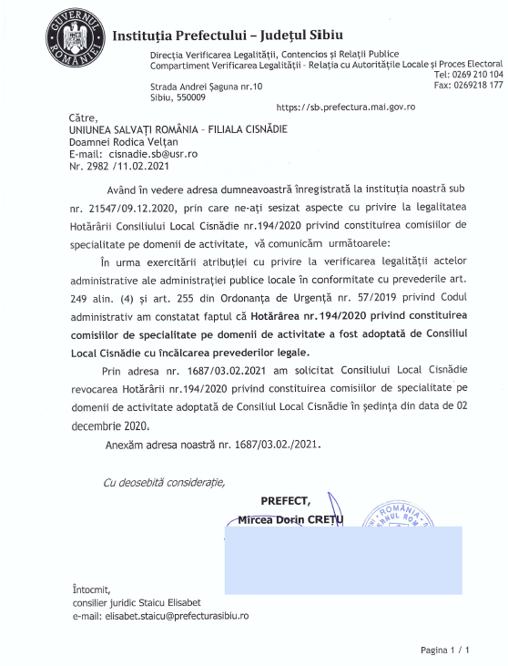 Atașăm răspunsul Prefecturii Sibiu.
