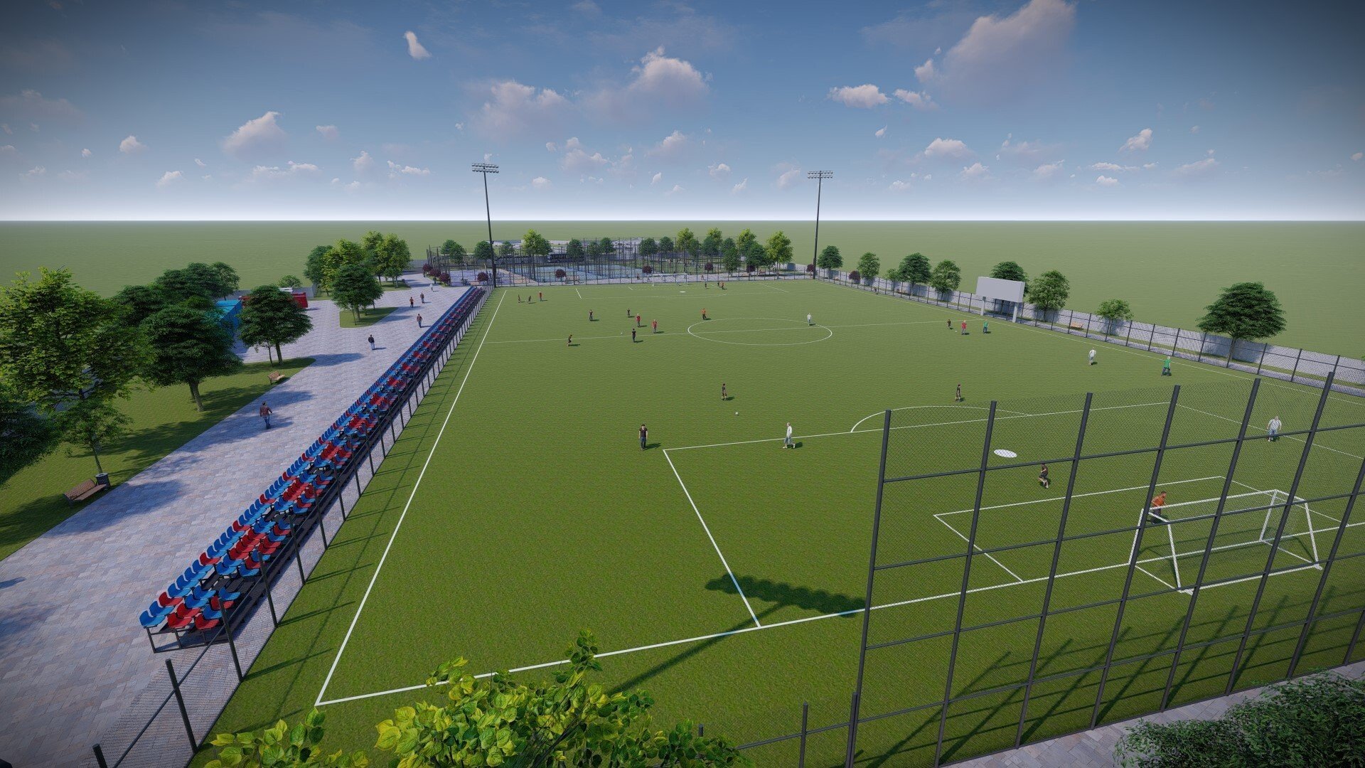 ✓ teren de fotbal de 68 x 105 metri, amenajat cu gazon și iluminat, dotat cu sisteme de drenare și de irigații; pentru spectatori se va crea o tribună cu aproximativ 500 de locuri