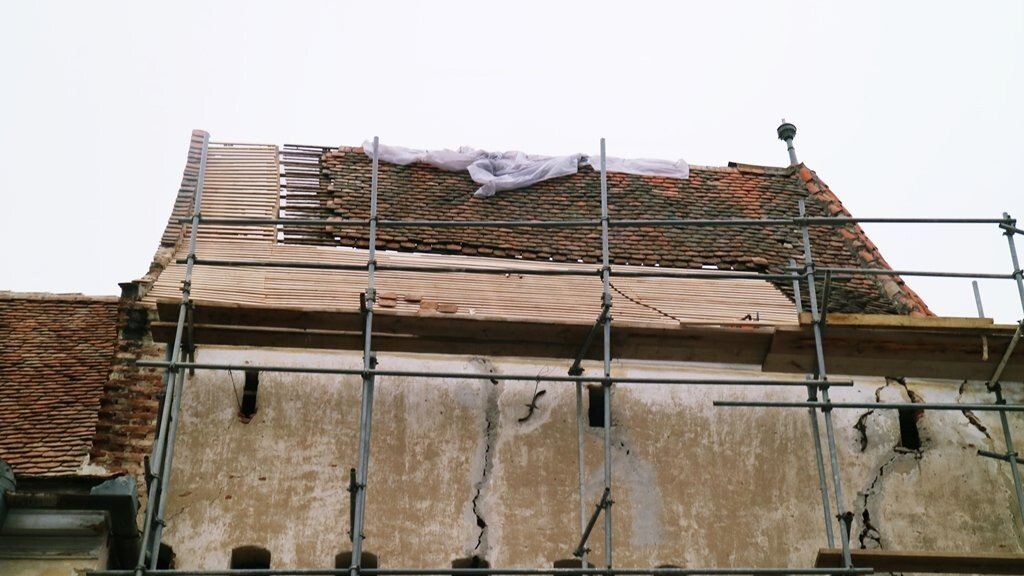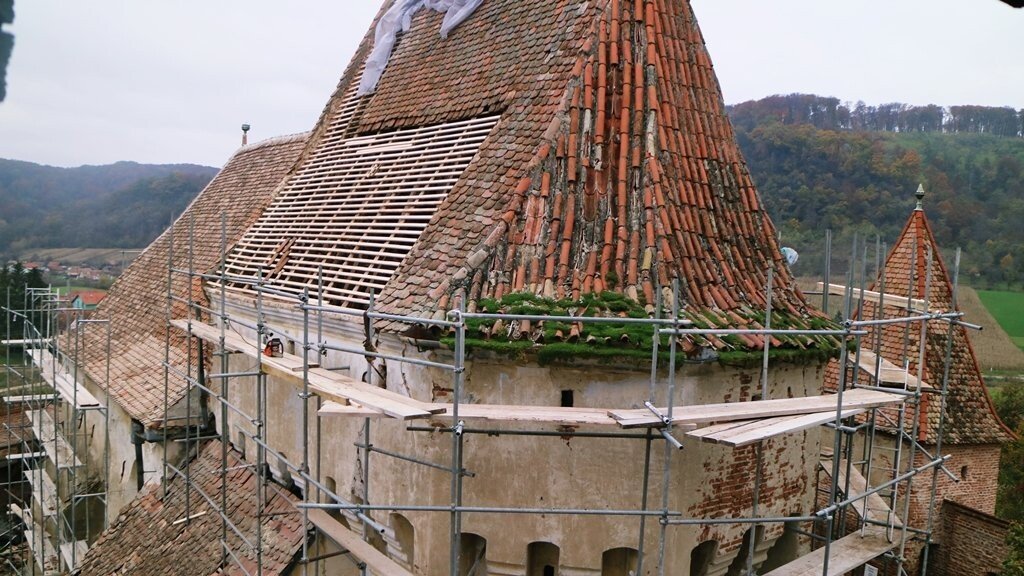 Constructorii s-au axat pe lucrări la rezistența și învelitoarea clădirii, la nivelul de apărare 2 și la șarpantă au fost înlocuite elementele degradate, au fost revizuite, recondiționate și montate piese originale din lemn la structura șarpantei. A fost demontată învelitoarea, țigla și solzii, inclusiv coamele, și au fost sortate țiglele bune. Pentru acestea din urmă, s-a efectuat un tratament biocid cu săruri cuaternare de amoniu împotriva depunerilor biologice, prin pensulare sau pulverizare.