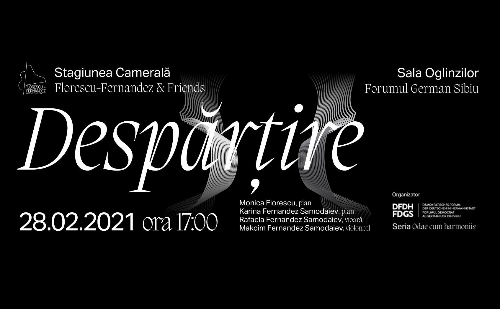 „Despărțire” este un concert-panaceu și un omagiu sonor oferit tuturor celor care au simțit durerea ce însoțește pierderea unui om drag. Publicul este așteptat duminică, 28 februarie, de la ora 17:00, în Sala Oglinzilor a Forumului German Sibiu pentru a asculta un program cu lucrări de Bach, Liszt, Händel, Clementi, Miaskovsky, Schubert, în interpretarea familiei de muzicieni Florescu-Fernandez: Rafaela Fernandez Samodaiev (vioară), Makcim Fernandez Samodaiev (violoncel), Karina Fernandez Samodaiev (pian) și Monica Florescu (pian).