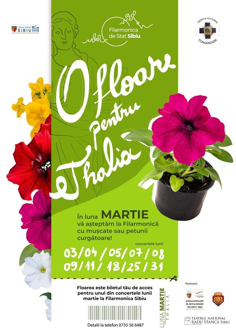 La Filarmonica Sibiu sărbătorim primăvara – muzical și vizual – pe parcursul întregii luni martie. După cenușiul iernii vom da culoare Sălii Filarmonicii prin intermediul proiectului ”O floare pentru Thalia”. Cu ajutorul comunității locale – spectatori sau agenți economici – fațada și terasele Sălii Thalia vor fi împodobite cu mușcate și petunii curgătoare. În schimbul florilor spectatorii vor primi bilete gratuite la evenimentele organizate de Filarmonica Sibiu.