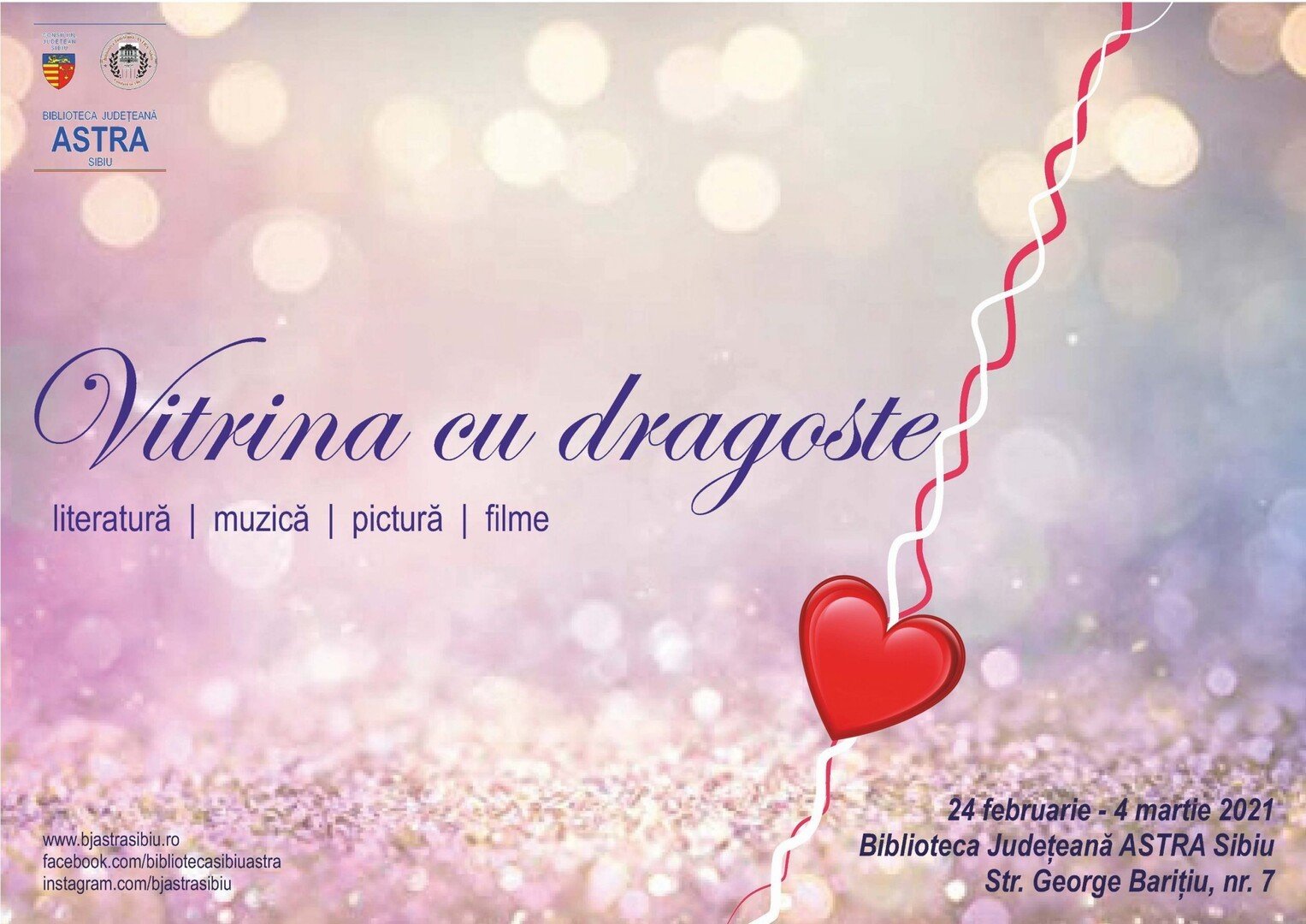 Cu prilejul Sărbătorii de Dragobete, „Vitrina cu dragoste” vă întâmpină cu literatură scrisă de cunoscuți autori români, muzică romantică și cele mai frumoase filme de iubire din colecțiile Bibliotecii ASTRA. Mihai Eminescu, Veronica Micle, Nichita Stănescu, Mihail Drumeș, Cella Serghi, Ștefan Augustin Doinaș, Ion Minulescu, Radu Stanca sunt câteva repere care vor stârni interesul vizitatorilor. În egală măsură, expoziția include studii etnografice despre Dragobete și alte sărbători tradiționale ale românilor: „Obiceiuri de peste an” și „Mitologie română” de Ion Ghinoiu, „Dragostea în datina tineretului român” de Tudor Pamfilie, „Datini, credințe și obiceiuri” de Gavrilă Florea, „Obiceiuri tradiționale românești” de Mihai Pop.