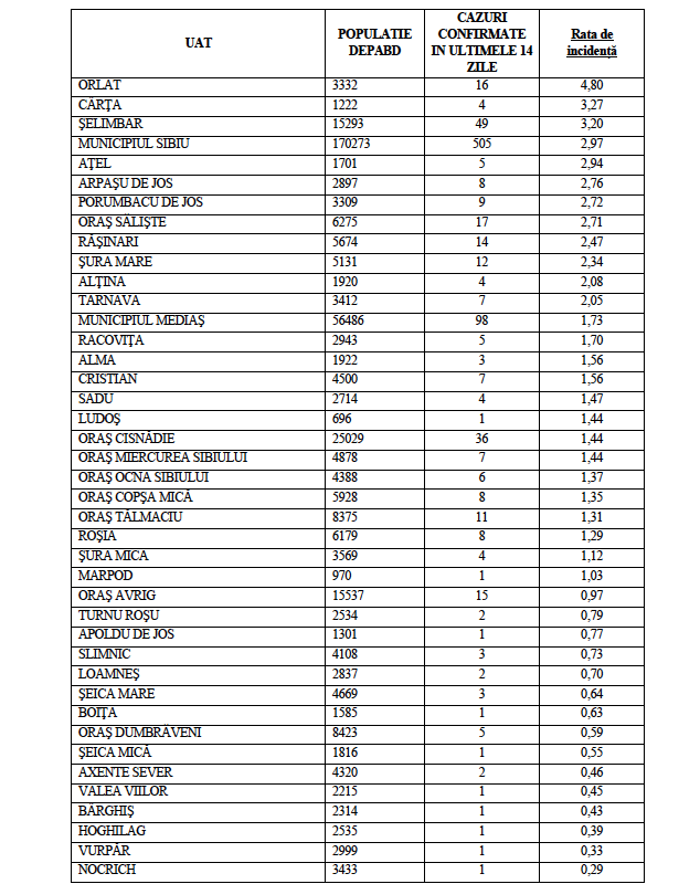 Rata de incidență cumulată la nivelul județului Sibiu este de 1,88/1000 de locuitori în ultimele 14 zile iar pentru municipiul Sibiu, rata este de 2.97. La nivelul județului Sibiu avem parte de o creștere alarmantă de cazuri COVID, în ultimele 24 de ore fiind depistate pozitiv 149 de persoane.