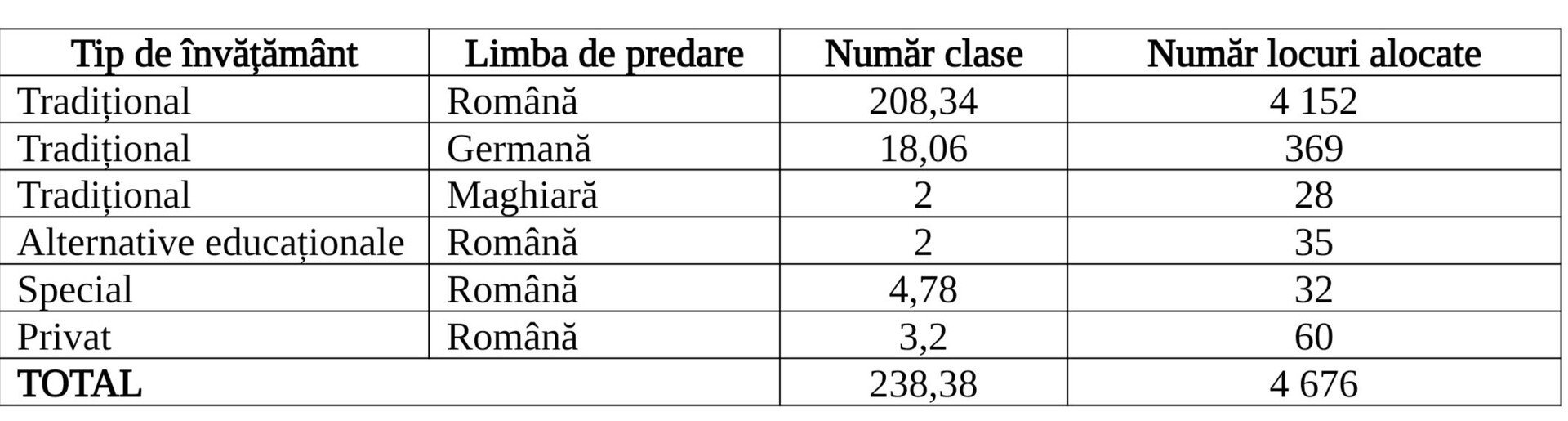La nivelul județului Sibiu a fost aprobat un număr de 238,38 clase, pentru un număr estimativ 4 676 de elevi. Pe tipuri de învățământ și limba de predare situație este următoarea: