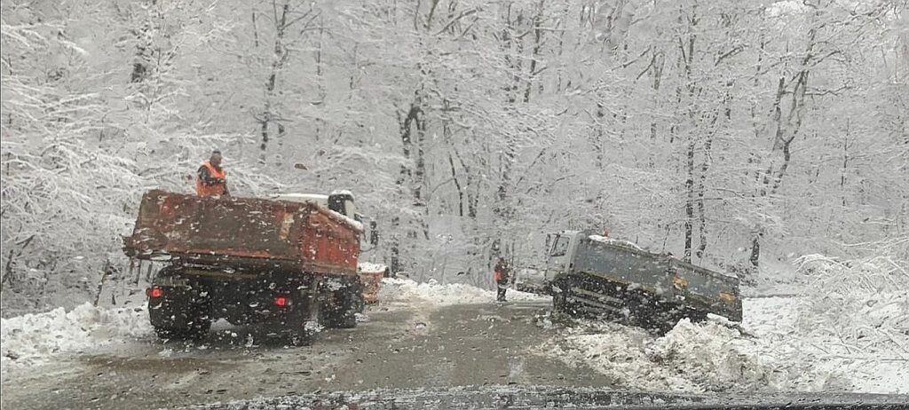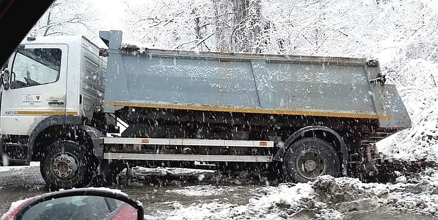 Mașina de deszăpezire era încărcată cu material antiderapant și asigura curățarea drumului de zăpadă pe ruta Sibiu – Cisnădioara.