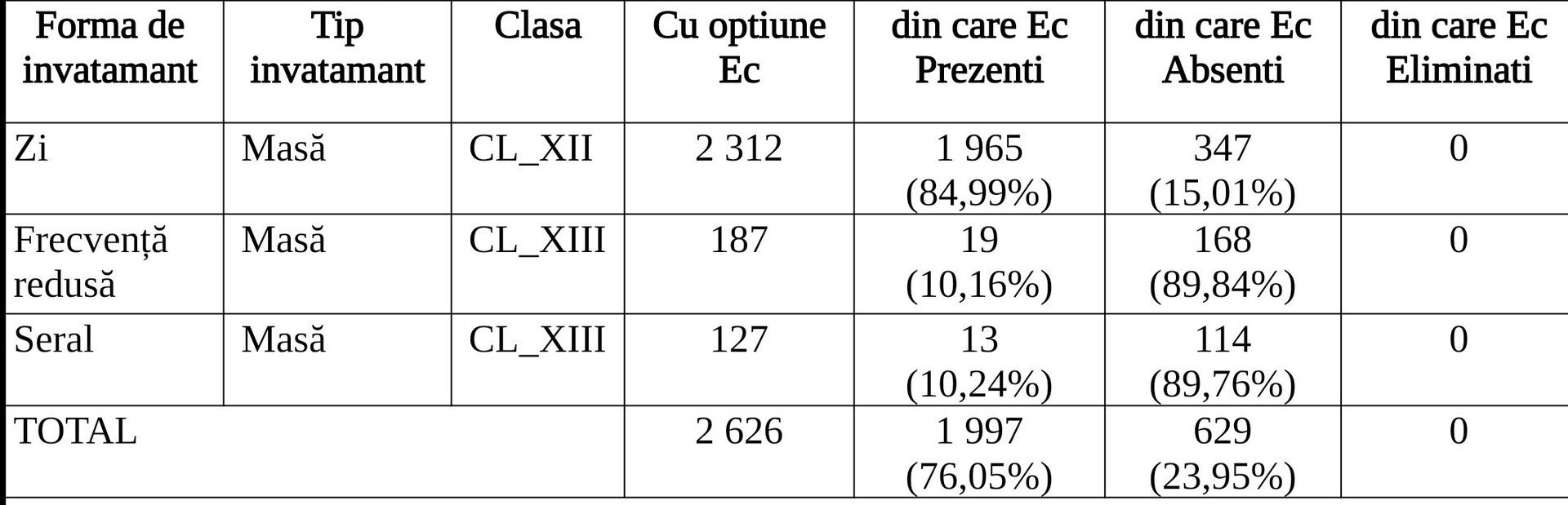 Situația centralizată pe an de studiu și forme de învățământ este următoarea:
