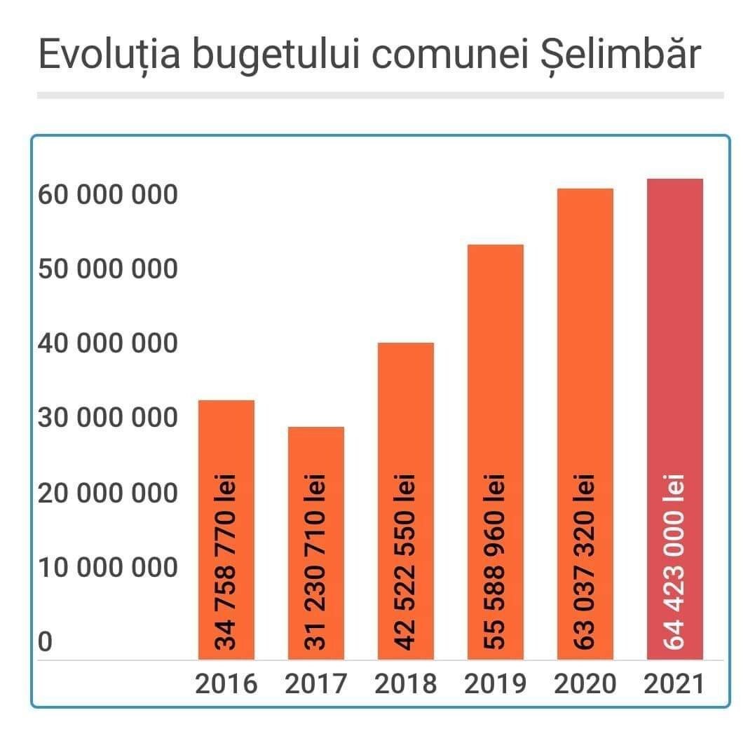 În acest an este pentru a doua oară când bugetul comunei Șelimbăr depășește 60 de milioane de lei, proiecția bugetară pentru anul în curs fiind de 64,42 milioane de lei. Din această sumă 26,29 milioane lei reprezintă excedentul anilor precedenți, iar acești bani sunt repartizați investițiilor deja contractate de către Primăria Comunei Șelimbăr și care se află în execuție în anul 2021.