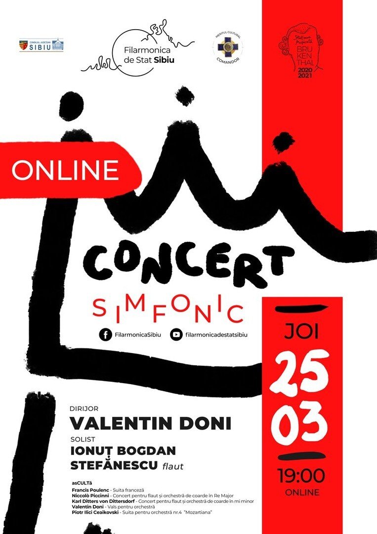 Ion Bogdan Ștefănescu, prim-flautistul Filarmonicii ”George Enescu”, va concerta în această săptămână alături de Orchestra Filarmonicii Sibiu și dirijorul Valentin Doni. Evenimentul este programat joi, 25 martie 2021 ora 19, și va fi transmis online pe pagina de facebook și canalul de Youtube al instituției.