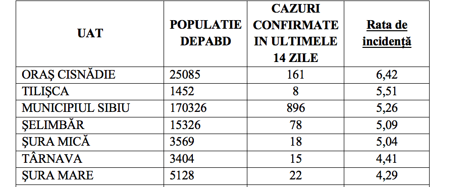 Rata de incidență cumulată la nivelul județului Sibiu este de 3,40/1000 de locuitori în ultimele 14 zile.