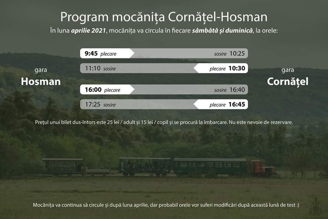 Începând de sâmbătă, 3 aprilie, Mocanița va circula în fiecare weekend între Hosman și Cornățel, cu două curse dus-întors.