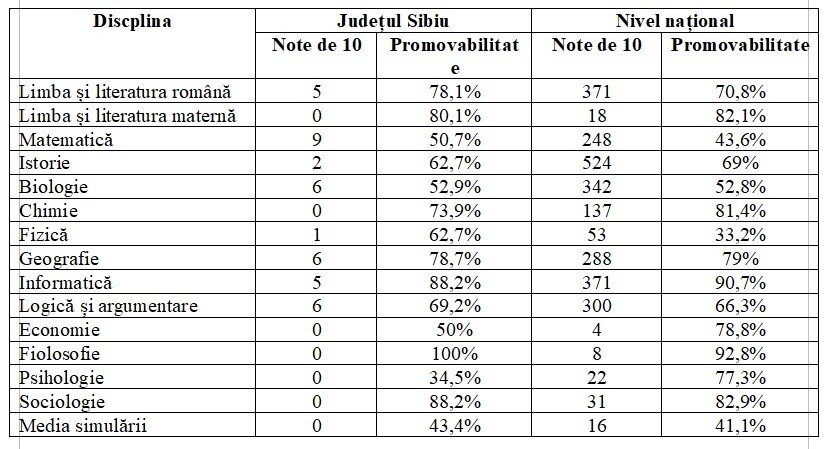 Note de 10 obținute pe probe la nivelul județului Sibiu și la nivel național.
