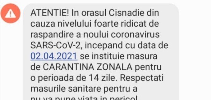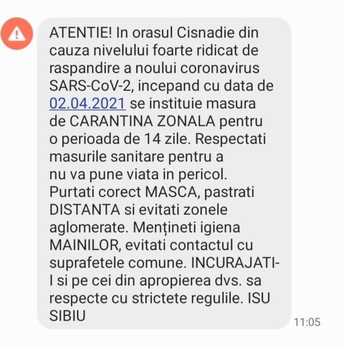 În urmă cu puțin timp ISU Sibiu a transmis un mesaj de avertizare și informare RO – ALERT privind CARANTINAREA ZONALĂ de astăzi a orașului Cisnădie.