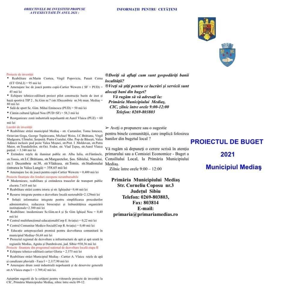 Miercuri, 7 aprilie bugetul a fost supus dezbaterii publice. Cu această ocazie, primarul municipiului Mediaș, dl Gheorghe Roman a declarat: