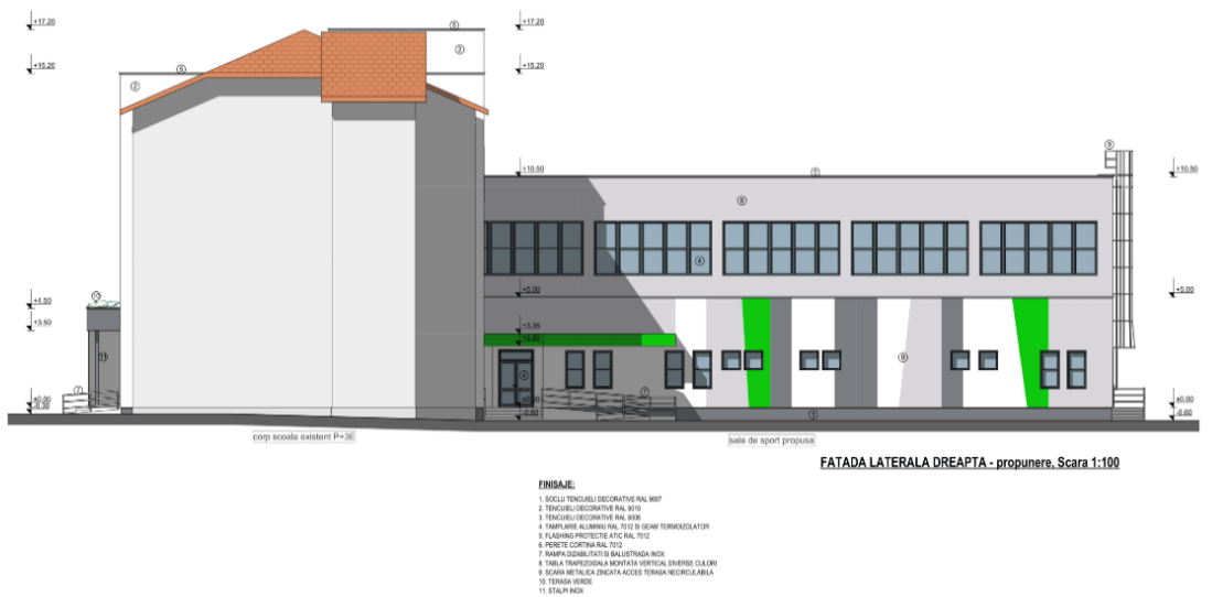 Sala de sport va avea o suprafață de peste 1.300 mp și va fi dotată cu vestiare, săli cu dușuri, grupuri sanitare, un cabinet medical și un depozit pentru materialele necesare desfășurării orelor de sport. Acoperișul zonei de acces în sală va fi amenajat ca terasă înierbată.