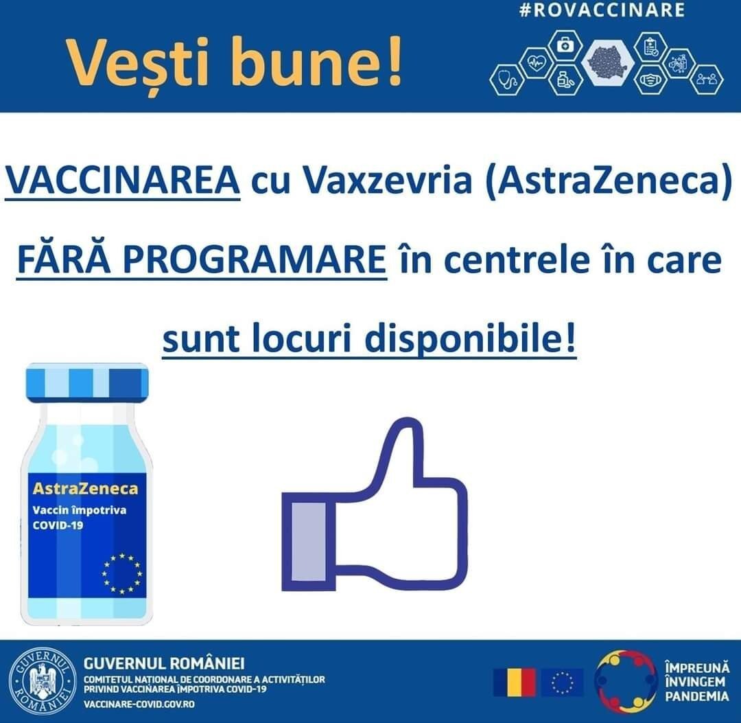 Pentru facilitarea accesului la vaccinare, în centrele în care se administrează vaccinul Vaxzevria (AstraZeneca) și în care sunt locuri disponibile, va fi permisă vaccinarea persoanelor care optează pentru acest tip de vaccin, prin prezentarea directă la centrul de vaccinare, fără a mai fi necesară înscrierea pe platformă, cu respectarea celorlalte proceduri și instrucțiuni.