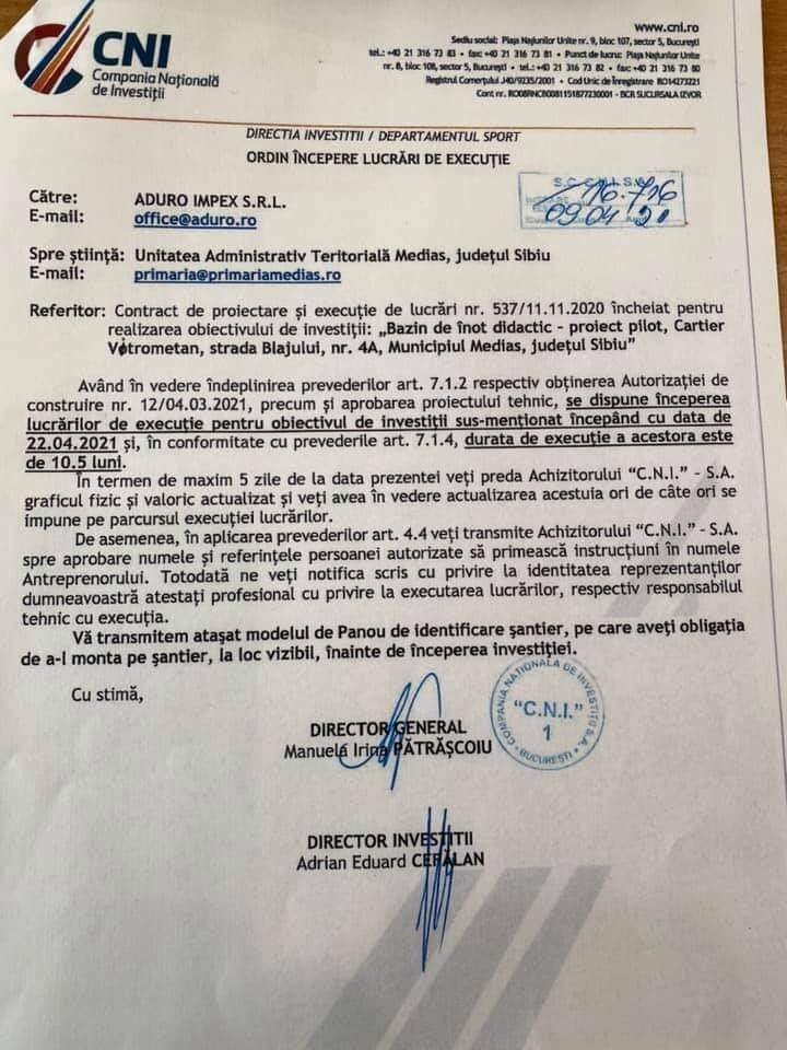 “O veste bună de la Compania Națională de Investiții. A fost transmis ordinul de începere a lucrărilor de execuție pentru obiectivul “Bazin de înot didactic“. Este un obiectiv pentru care Primăria Mediaș a transmis o solicitare în urmă cu aproximativ 10 ani. Mă bucur că am reușit să conving factorii de decizie că acest obiectiv este important pentru copiii din Mediaș”, a declarat primarul municipiului Mediașului, Gheorghe Roman, pe pagina sa Facebook.