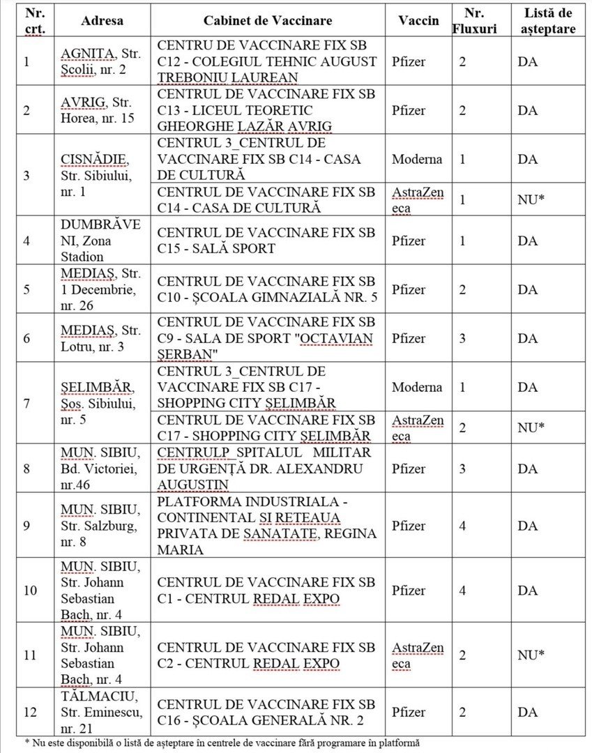 Detalii despre cabinetele de vaccinare de pe raza județul Sibiu, a numărului de fluxuri disponibile și tipurile de vaccin utilizate: