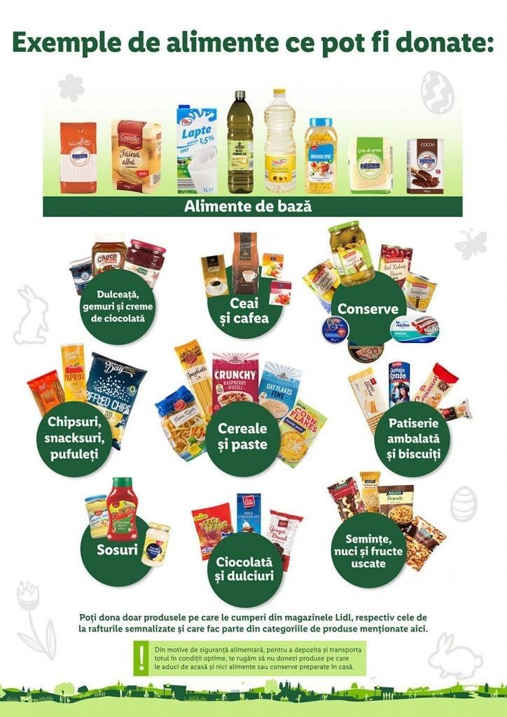 Produse ce pot fi donate (produse neperisabile și care nu necesită temperatură joasă de păstrare): cereale, dulciuri, patiserie ambalată și biscuiți, dulceață-gemuri-cremă de ciocolată, ceai, biscuiti și napolitane, semințe, nuci și fructe uscate, chipsuri-snacksuri-pufuleti-covrigei, alimente de bază (ulei, făina, zahăr, orez, ingrediente de copt), conserve de legume, conserve de carne, conserve de fructe, paste fainoase, sosuri, lapte UHT (care se păstrează la temperatura camerei).