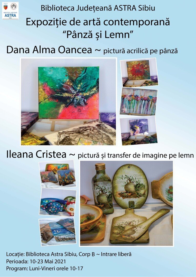 În perioada 10 – 23 mai 2021, Biblioteca Județeană ASTRA Sibiu găzduiește Expoziția de artă contemporană „Pânză și Lemn”. Publicul sibian este invitat să admire lucrări inedite semnate de Dana Alma Oancea (pictură acrilică pe pânză) și Ileana Cristea (pictură și transfer de imagine pe lemn). Sunt remarcabile viziunea coloristică și minuțiozitatea prin care cele două artiste pun în lumină teme florale, gastronomice, peisaje citadine și marine.