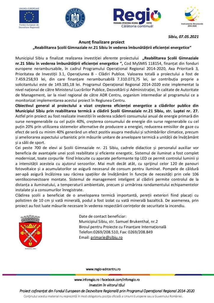 Anunț finalizare proiect „Reabilitarea Școlii Gimnaziale nr.21 Sibiu în vederea îmbunătățirii eficienței energetice“