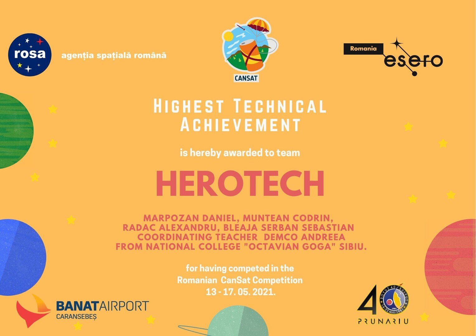 Concursul CanSat tocmai ce a fost finalizat cu succes de către noi în data de 17/05/2021, fiind premiați cu distincția de cea mai înalta realizare tehnologică.”