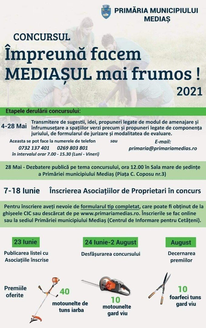 Primăria municipiului Mediaș organizează concursul Împreună facem MEDIAȘUL mai frumos 2021. Premiile oferite sunt 40 motounelte de tuns iarba, 10 motounelte gard viu, 10 foarfeci tuns gard viu.