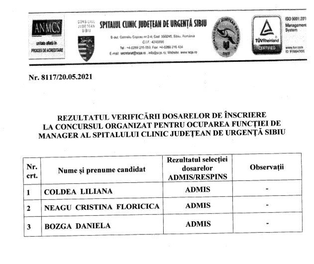 La funcția de manager a Spitalului Județean Sibiu candidează Liliana Coldea, Neagu Cristina și B.D.