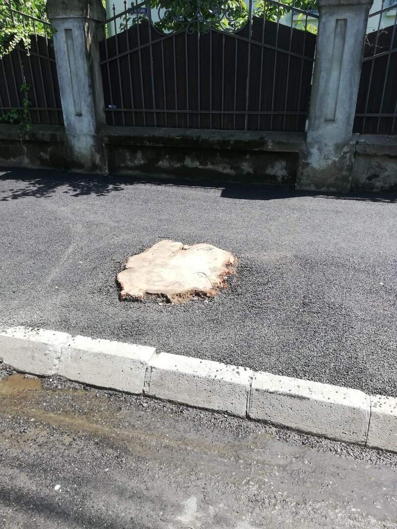 Și, pentru ca rețeta unei execuții deplorabile să fie completă, la câțiva metri distanță s-a turnat asfalt în jurul unui proaspăt ciot. Oare este cazul să întrebăm de ce acel copac nu a fost scos din rădăcină? Ori că era prevăzută replantarea ori că nu, era normal ca rădăcinile să fie îndepărtate. Din punctul meu de vedere plantarea unui nou copac în locul celui vechi e necesară, lucru pe care l-am și solicitat.