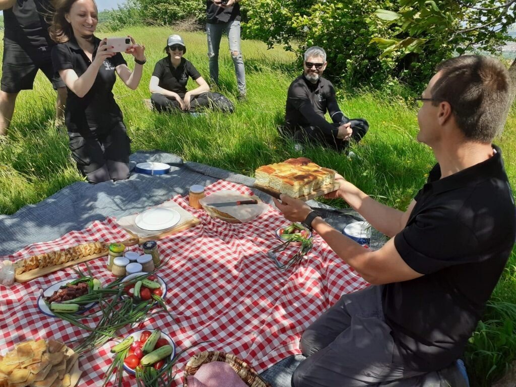 După picnicul din zona de belvedere Daniela Cîmpean a fost invitată să manevreze un zmeu. Exerciţiu dificil cu un zmeu profesional pe un vânt puternic. Dar preşedinta CJ a ascultat indicaţiile maestrului în zmee şi a încercat manevrarea. Apoi a lansat provocarea presei, iar subsemnatul am încercat cu multă forţă şi puţină dexteritate şi am înălţat un zmeu între cele două localităţi: Răşinari şi Cisnădioara.