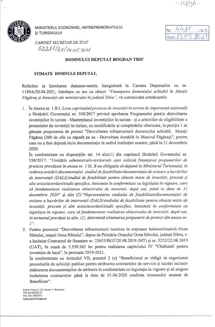 Deputat Bogdan Trif, Președintele Organizației Județene PSD Sibiu, în urma întrebării adresate Ministerului Economiei, Antreprenoriatului și Turismului, în legătură cu „Dezvoltarea infrastructurii domeniului schiabil Munții Făgăraș (200 de zile cu zăpadă pe an – Dezvoltare durabilă în Masivul Făgăraș)”, a transmis următorul comunicat de presă: