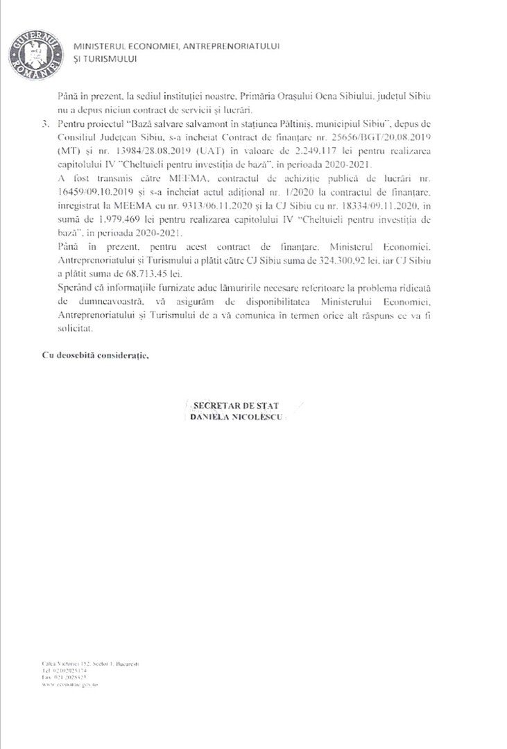 În perioada mandatului meu de ministru al Turismului, am finanțat toate proiectele depuse de autoritățile locale din județul Sibiu. Din păcate, au fost depuse doar două: Construirea punctului Salvamont Păltiniș (depus de Consiliul Județean Sibiu) și Dezvoltarea infrastructurii turistice în stațiunea balneoclimaterică Ocna Sibiului (depus de Primăria Ocna Sibiului).