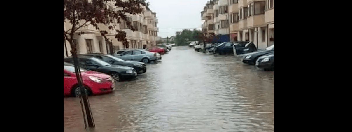Sistemul pluvial de pe strada Ceaikovski din cartierul sibian Gușterița nu a mai făcut față ploilor abundende din ultima perioadă și a refulat, inundând complet strada.
