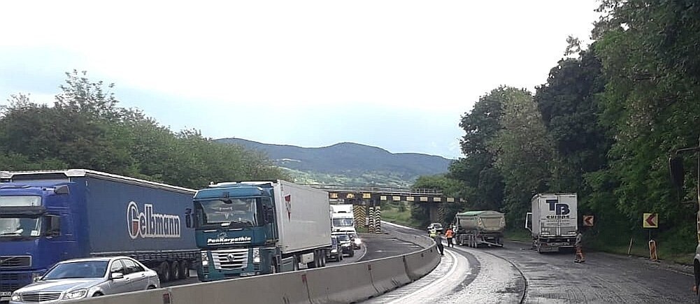 Traficul rutier este blocat total lângă Veștem după ce două autocamioane au intrat în coliziune.