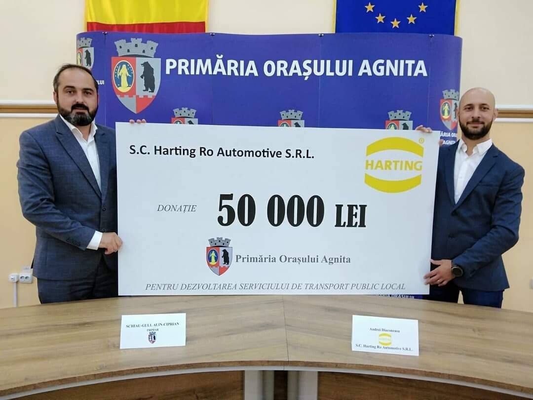 Firma HARTING RO AUTOMOTIVE a oferit Primăriei Orașului Agnita o donație în valoare de 50 000 de lei pentru dezvoltarea serviciului de transport public local, potrivit unui anunț făcut de primarul orașului Agnita, Schiau Gull Alin Ciprian, pe pagina sa de Facebook.