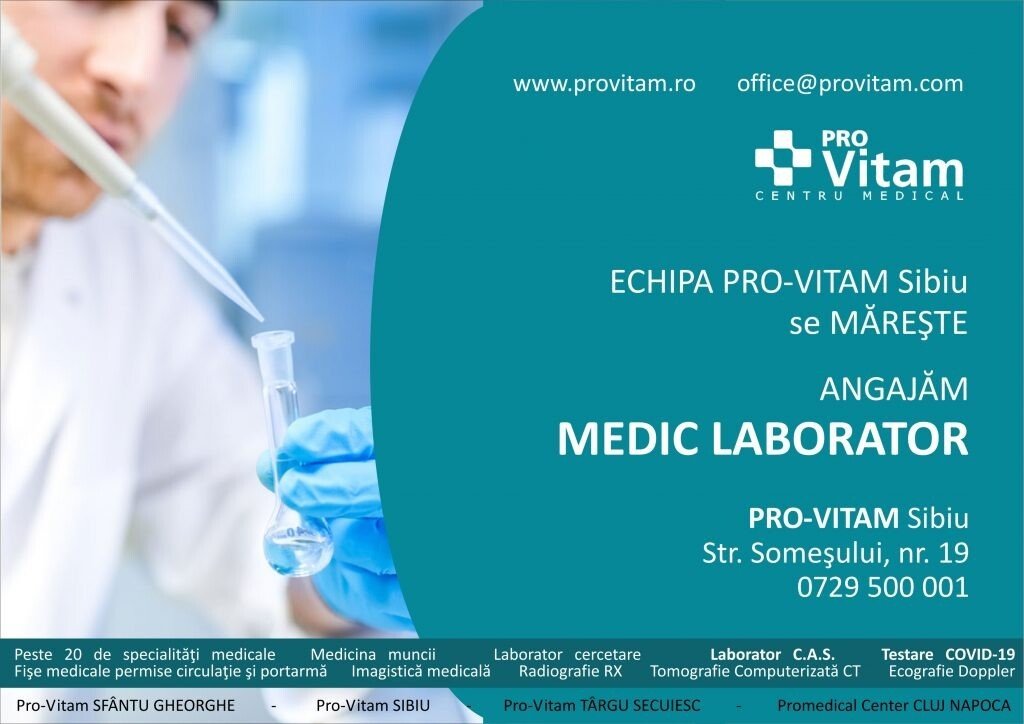 Centrul de Cercetare, Diagnostic și Tratament Pro-Vitam ÎȘI MĂREŞTE ECHIPA din SIBIU. Căutăm colegi noi – MEDIC DE LABORATOR – atât cu experiență cât și proaspăt absolvenți de rezidențiat (cu certificat de membru CM valabil).