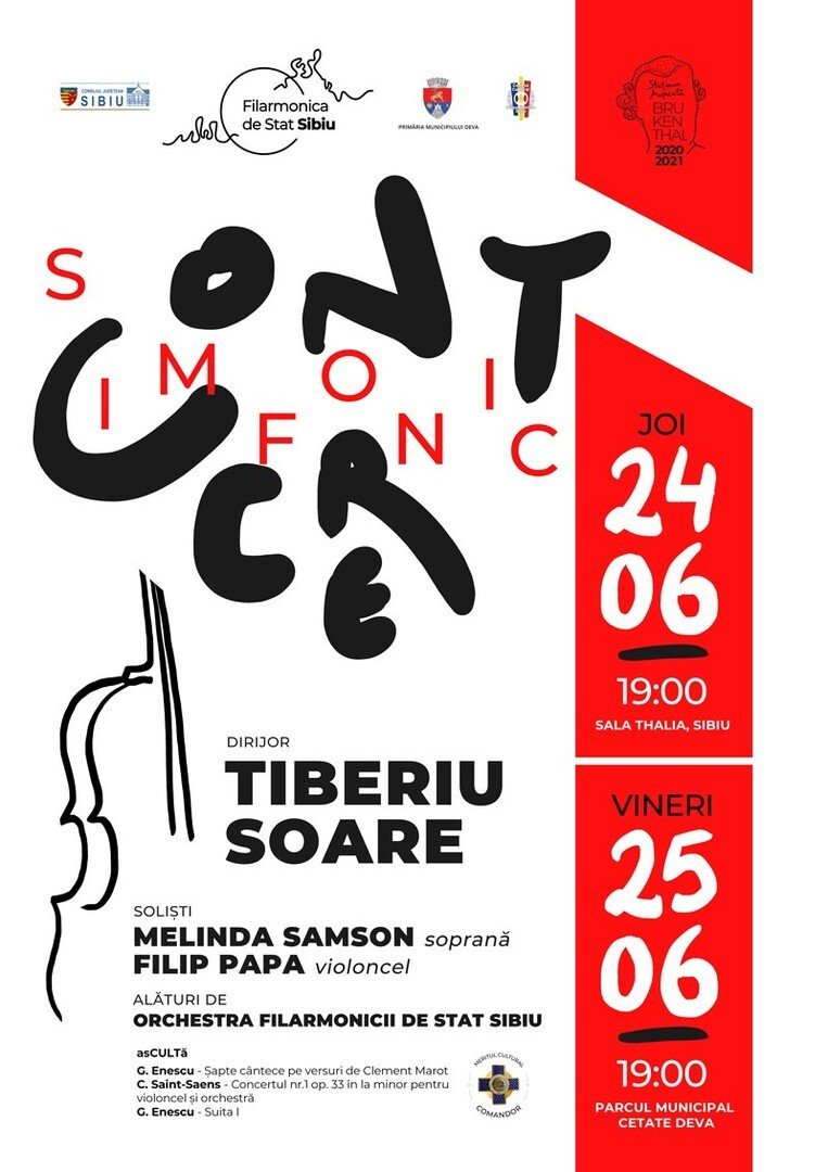 Sezonul de concerte 2020-2021 organizat de Filarmonica Sibiu și intitulat sugestiv ”Stațiunea Muzicală Brukenthal” pentru a prefața evenimentele culturale dedicate aniversării a 300 de ani de la nașterea Baronului Samuel von Brukenthal, se închide în această săptămână cu două concerte vocal-simfonice programate la Sibiu și Deva, cu artiști invitați din cele trei provincii istorice al României: dirijorul Tiberiu Soare (București), soprana Melinda Smason (Sibiu) și violoncelistul Filip Papa (Iași). George Enescu și Camille Saint-Saëns sunt compozitorii ale căror lucrări vor fi prezentate joi 24 iunie 2021 (Sibiu – Sala Thalia, ora 19 ) și vineri 25 iunie 2021 (Deva – Parcul Cetății, ora 19).