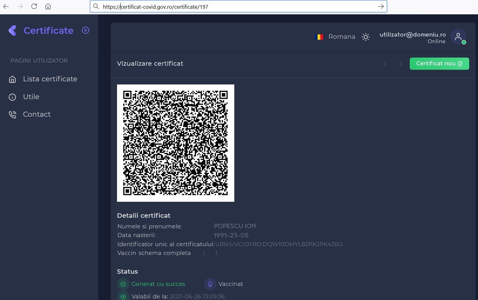 * În momentul generării certificatului, persoana care l-a solicitat este notificată prin e-mail.