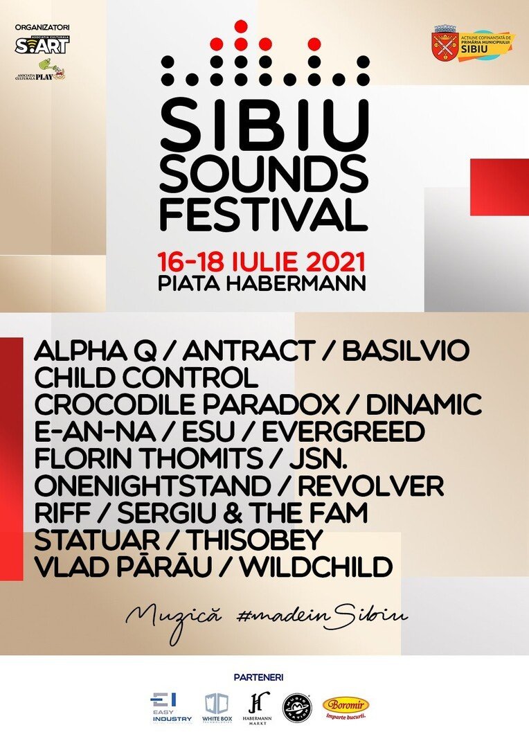 ALPHAQ, ANTRACT, BASILVIO, CHILD CONTROL, CROCODILE PARADOX, DINAMIC, E-AN-NA, ESU, EVERGREED, FLORIN THOMITS, JSN., ONENIGHTSTAND, REVOLVER, RIFF, SERGIU & THE FAM, STATUAR, THISOBEY, VLAD PĂRĂU, WILDCHILD vor aduce pe scenă sunetele orașului nostru în cadrul Sibiu Sounds Festival. Prezentarea concertelor va fi realizată de BORCO.