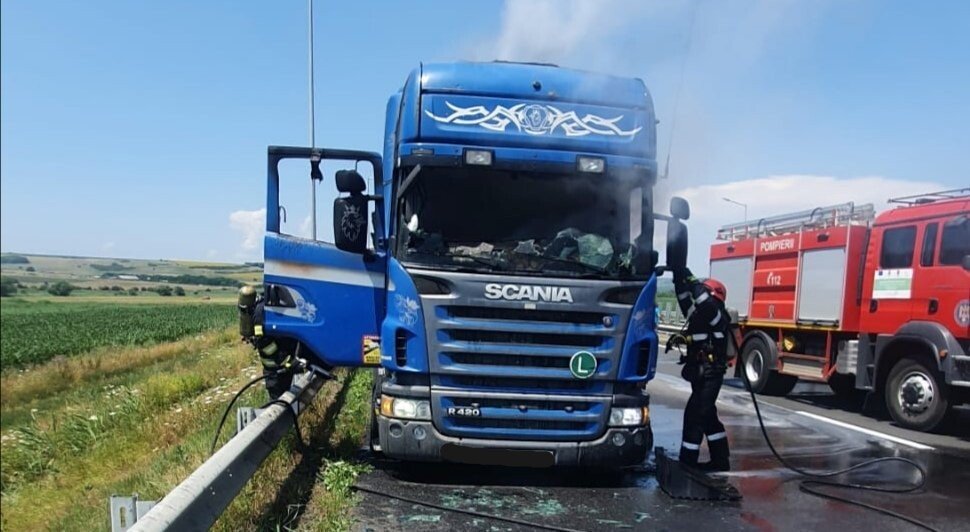 FOTO: Motorul unui autocamion a luat foc pe A1, lângă Cunţa