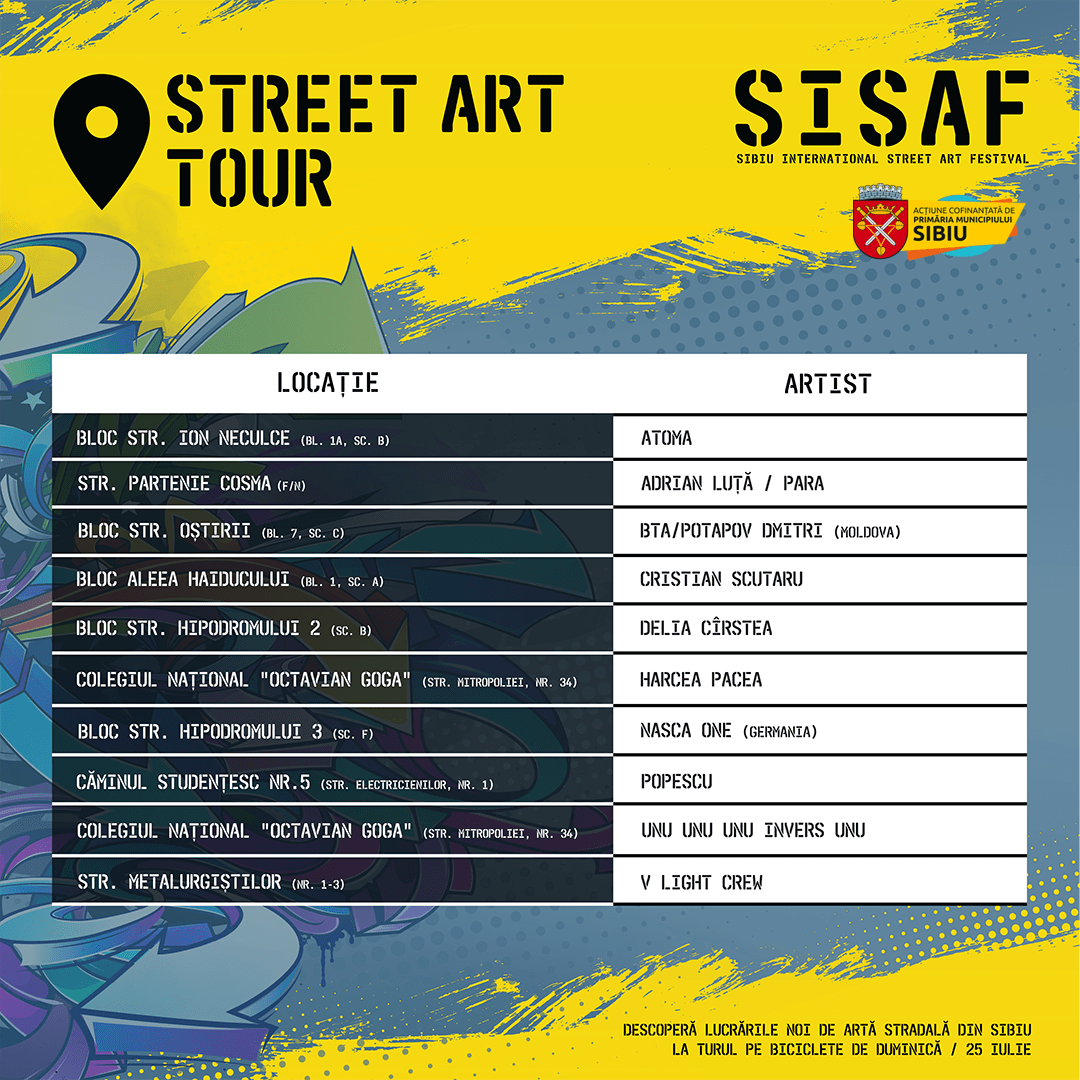 Ultima zi de festival – duminică, 24 iulie, marchează punctul culminant al ediției – momentul în care publicul, alături de artiști, pornesc la drum pe biciclete, în cadrul Sibiu Street Art Tour. Se vor face opriri în toate cele 10 locații revitalizate în acest an și se vor admira în premieră lucrările finalizate, ce completează turul de artă stradală al Sibiului, cel mai mare de acest gen din România și unul dintre cele mai importante din lume. Până la această ediție, circuitul cuprinde 96 de picturi murale și peste 9.700 metri pătrați de culoare.