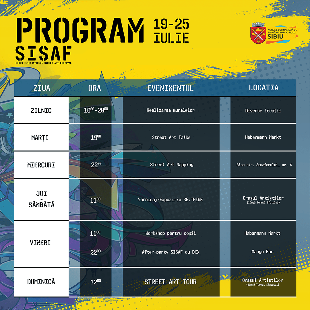 Astăzi începe ediția a VII-a a Festivalului Internațional de Artă Stradală din Sibiu (SISAF), ce își propune ca în timpul acestei săptămâni să transforme prin picturi murale 10 locații din Sibiu și să activeze diferite zone ale orașului prin evenimente în spiritul culturii urbane.