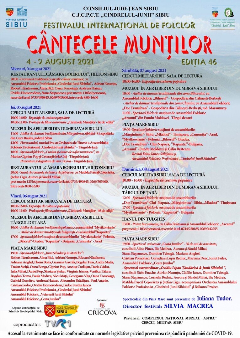 * Obiceiurile, gastronomia tradițională, cântecele și dansurile populare românești și internaționale își dau întâlnire la cea de-a 46-a ediție a Festivalului Internațional de Folclor „Cântecele Munților”, transformând Sibiul, în 4-9 august 2021, într-o casă a patrimoniului cultural universal.