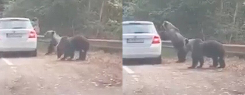 În imaginile video se poate observa cum turiștii încearcă să hrănească cei doi urși apăruți subit pe partea carasabilă, însă în scurt timp, unul dintre urși se năpustește asupra mașinii și se urcă cu labele pe portiera din spate a mașinii. Din fericire, reacția rapidă a turiștilor a făcut ca o tragedie să fie evitată. Acum doar două săptămâni, un alt turist a fost la un pas să fie rănit de un urs, în timp ce încerca să facă poze animalului.