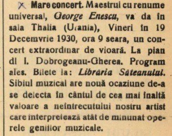 La deplină maturitate creativă, George Enescu “descăleca” în glorie la Sibiu, un oraș al muzicii de care avea să devină legat spiritual pentru totdeauna. “Celebrul artist George Enescu vine la Sibiu, pentru un concert de vioară. Toate concertele sale, date în Paris şi în alte mari orașe europene, au dovedit genialitatea marelui nostru artist. Sibienii cari apreţiază muzica, nu vor pierde ocazia de-a asculta arta miraculoasă a neîntrecutului măestru, care a publicat numeroase compoziţii de simfonii, sonate, rapsodii, poeme, variaţiuni, melodii ş.a. Enescu a început să compună de timpuriu, dela vârsta de 16 ani, (acum e de 42 de ani). A studiat în conservatorul din Viena şi Paris; a fost elev al lui Hellmesberger, Faure şi Massenet. Este adept al şcoalei moderne franceze”, menționa “Telegraful Român” înaintea primului concert, susținut de Enescu pe 13 mai 1921, la Sala Urania. “O lume numeroasă şi aleasă”, printre care se aflau mitropolitul Ardealului, IPS Nicolae Bălan, ofiţeri superiori sau deputaţi sinodali a venit să-l admire pe “marele măestru al vioarei” care cucerea definitiv Sibiul. “Primit cu omagii, maestrul care este astăzi o glorie strălucită şi în străinătate, a executat, în mijlocul unor aplause frenetice, programul alcătuit din compoziţiile geniilor muzicale. Interpretarea splendidă, în stil francez, distins prin claritate şi fineţă desăvârşită, a format pentru Sibiul cunoscător de muzică un eveniment artistic de întâiul rang. Ni s’a dat o seară de sărbătoare, în care sufletele ascultătorilor au fost transplantate în plaiurile, unde «totu-i vis şi armonie»…”, titra gazeta sibiană, cu entuziasm, în următoarea ediție.