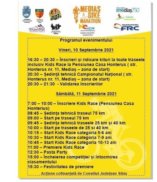 Sâmbătă, 11 septembrie 2021 municipiul Mediaș va găzdui cea de a IV-a ediție a competiției de tip cross country ,,Medias Bike Marathon“, un eveniment sportiv de excepție, care va aduna la startul său peste 600 de sportivi, amatori și licențiați, din țară și străinătate.